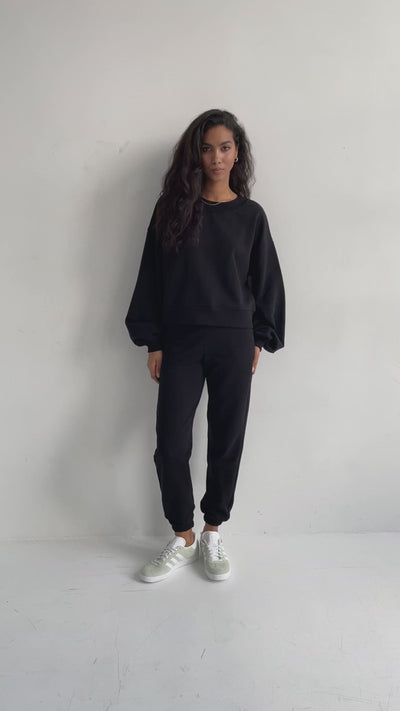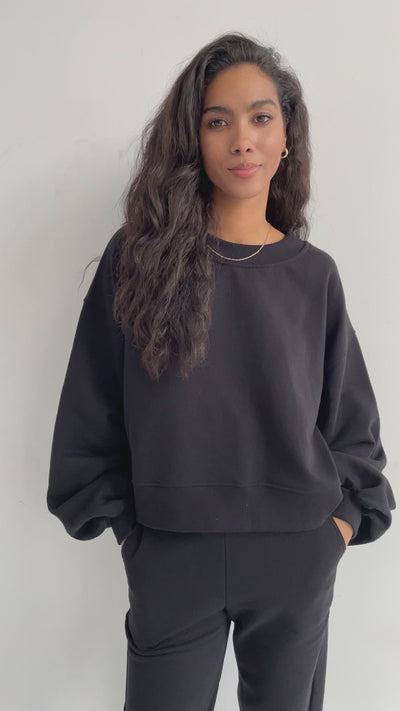 Krótka bluza o pudełkowej formie z przeskalowanymi, długimi rękawami. Nasza propozycja nietuzinkowej bluzy, która idealnie będzie współgrała ze spodniami z wyższym stanem. Dzięki zastosowaniu zmiękczenia i antypillingu kolory utrzymują się nawet po długim czasie użytkowania. Noś w zestawie z naszymi spodniami dresowymi black, dżinsami z wyższym stanem czy leginsami.