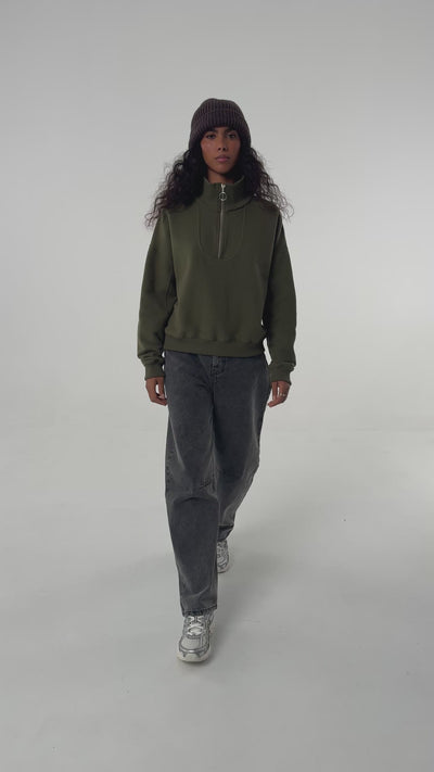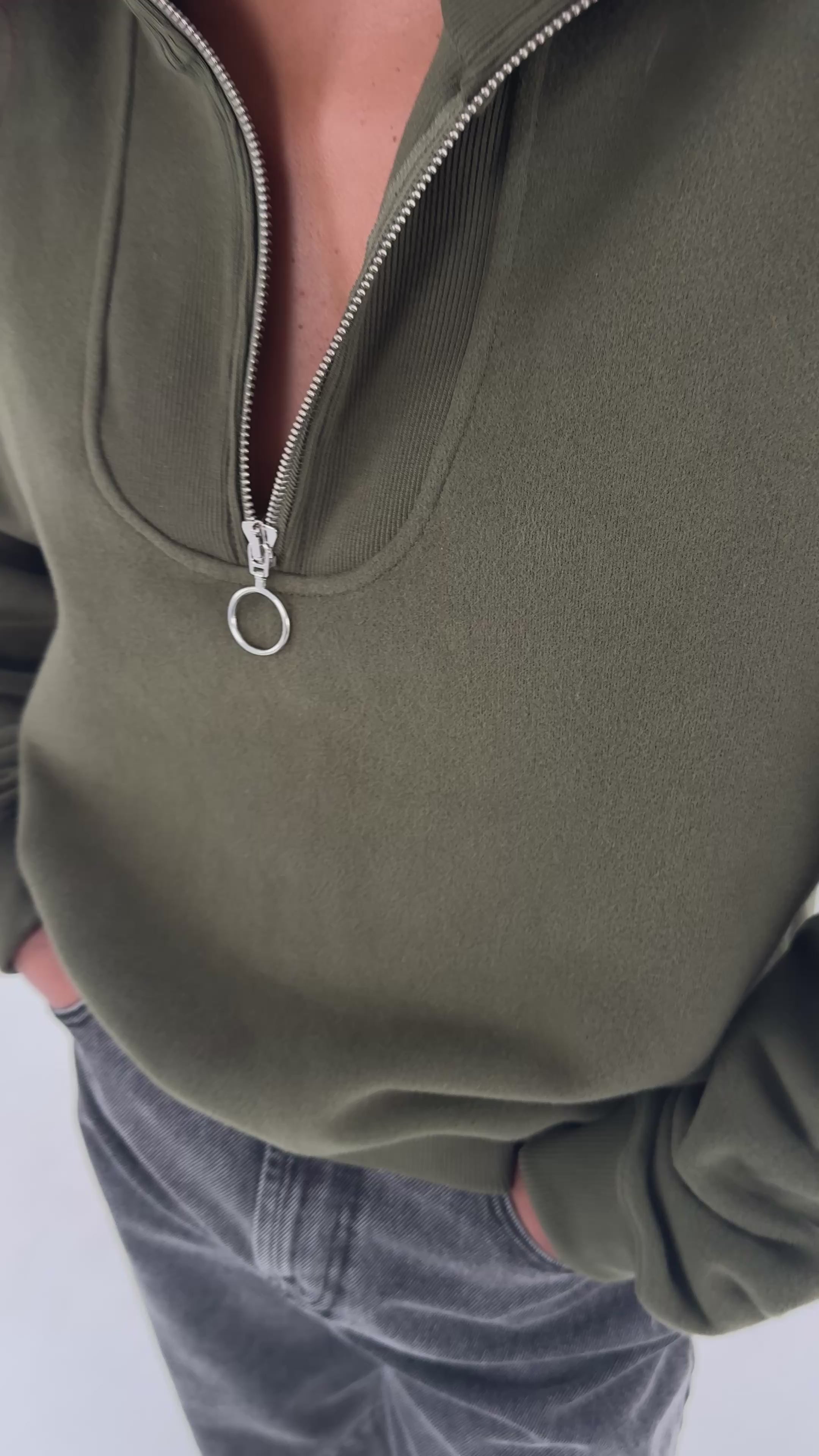 Ponadczasowa bluza dresowa Zipi to must-have w każdej szafie. Wraca w kolorze sezonu khaki, łączy w sobie styl i wygodę. Fason wkładany przez głowę, z dekoltem na metalowy suwak, nadaje jej unikalny charakter, a ozdobna końcówka zamka jest subtelnym, ale efektownym detalem. Wykonana z wysokiej jakości, ocieplanej dresówki, od środka wykończona mięciutkim „misiem”, co sprawia, że jest niezwykle przyjemna dla skóry i doskonale otula w chłodne dni.