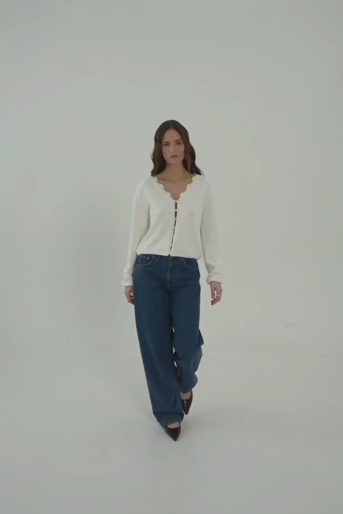 Lekki sweterek typu kardigan, który idealnie dopełni wiosenno-letnie stylizacje. Klasyczny dekolt w kształcie litery V i zapięcie na guziki nadają mu ponadczasowego charakteru, a ażurowe wykończenie przy dekolcie w formie subtelnej falbanki wprowadza do fasonu nutę delikatności.