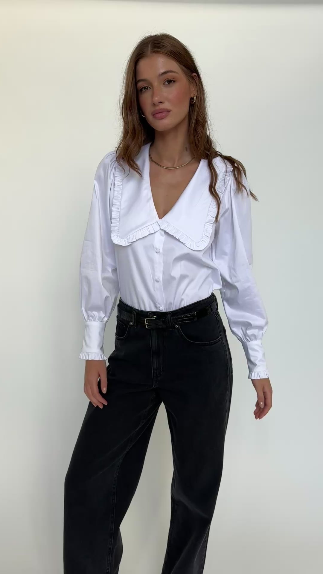 Duży, ozdobny kołnierz, mankiety zakończone subtelną falbanką i oblekane tkaniną guziki tworzą eleganckie, kobiece detale. Koszula Laureen świetnie sprawdzi się w codziennych stylizacjach z jeansami lub spodniami, a także w bardziej eleganckich zestawieniach z marynarką lub spódnicą.