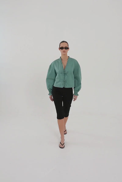Maya w nowych kolorach - denim i teal - uszyta z lżejszej, przyjemnej w noszeniu bawełny. To model, który łączy swobodę z kobiecymi detalami. Pudełkowy krój, bufiaste rękawy zakończone gumką i falbanką oraz wiązanie na troczek nadają jej charakteru i subtelnej lekkości.