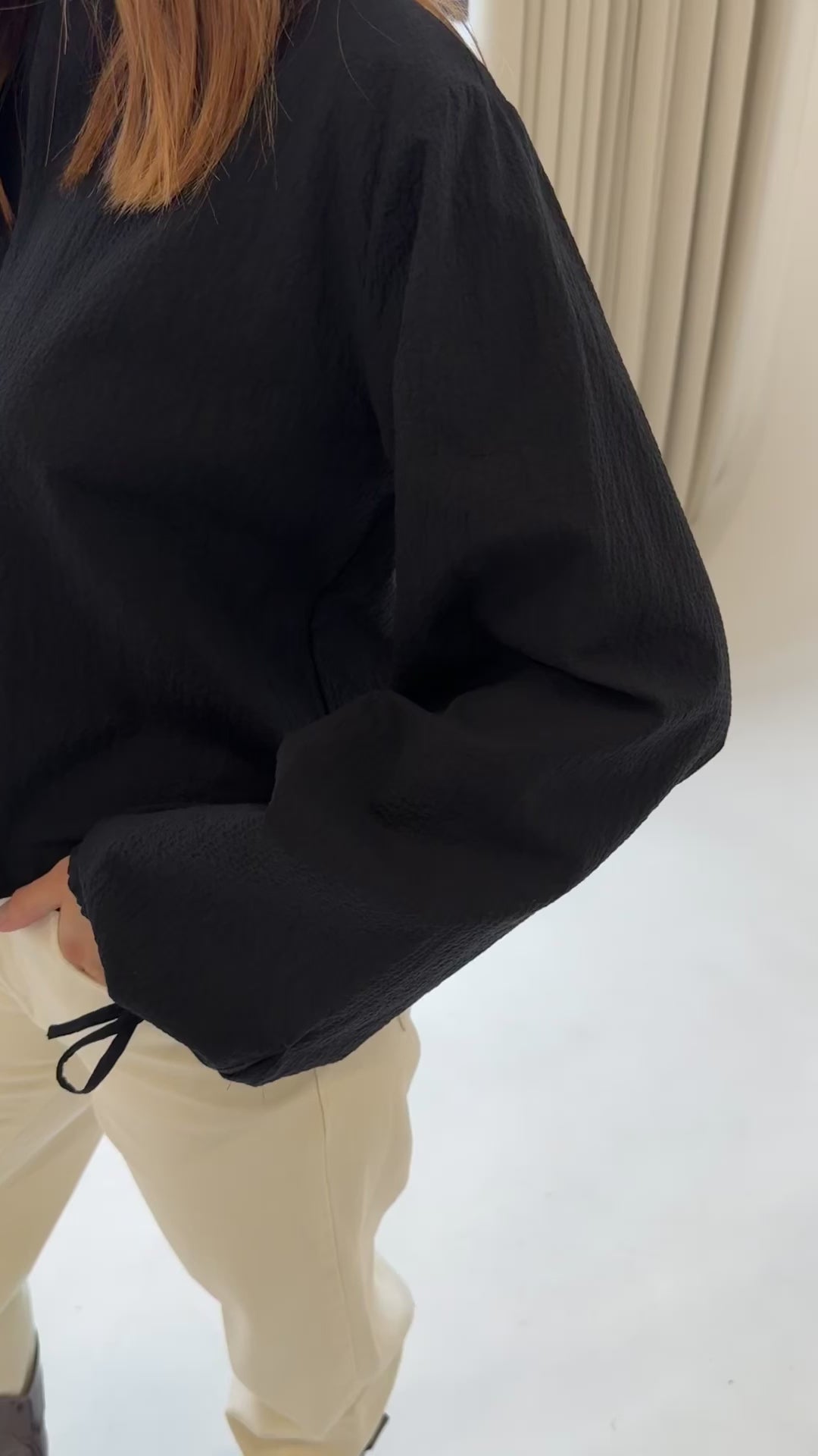 - Długie rękawy zakończone wiązaniem