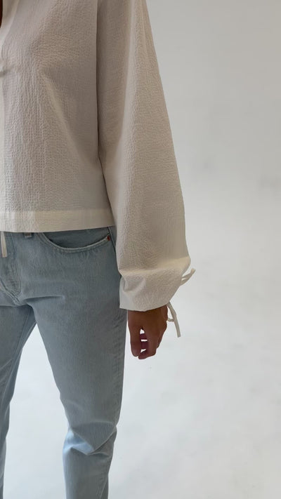 Koszula Pixie to pudełkowa, minimalistyczna forma wiązana na delikatne troczki na wysokości biustu. Uszyta z pięknej tkaniny z delikatną fakturą. Uroku dodaje jej wiązane wykończenie rękawów. Można nosić ją jako narzutkę na top lub solo. Noś z ulubionymi dżinsami lub tkaninowymi spodniami. Jedno jest pewne – w tej koszuli zwrócisz na siebie uwagę!