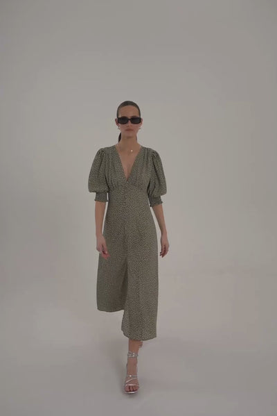 Frida to nowa sukienka idealna na wiosenno-letnie dni. Długość midi i subtelny rozporek z przodu zapewniają swobodę ruchu, a krótkie, bufiaste rękawki zakończone gumką gwarantują wygodne dopasowanie. Dekolt w kształcie litery V oraz wiskozowa tkanina w charakterystyczny print dodają lekkości, natomiast ozdobne, oblekane guziczki biegnące wzdłuż sukienki przyciągają uwagę, tworząc wyjątkowy detal. Sukienkę Frida założysz na wiele okazji - wystarczy dobrać odpowiednie buty, np. klapki, baleriny, sandały, szpilki lub sneakersy.
