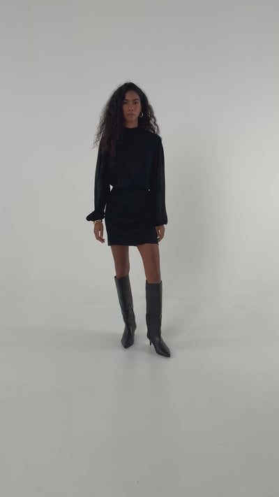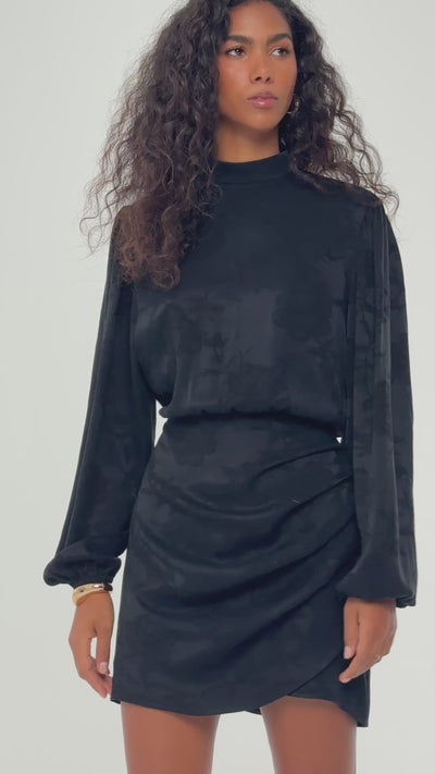To sukienka, która przyciąga spojrzenia i podkreśla wyjątkowy charakter każdej stylizacji. Jackie jacquard black w mini długości łączy prostą, zabudowaną górę ze stójką przy szyi z efektownie drapowanym dołem, który nadaje lekkości i ruchu. Rękawy zakończone gumką dodają komfortu, a tkanina z mieszanki cupro i wiskozy z tłoczonym, kwiatowym żakardowym wzorem pięknie odbija światło, tworząc subtelny, luksusowy efekt.