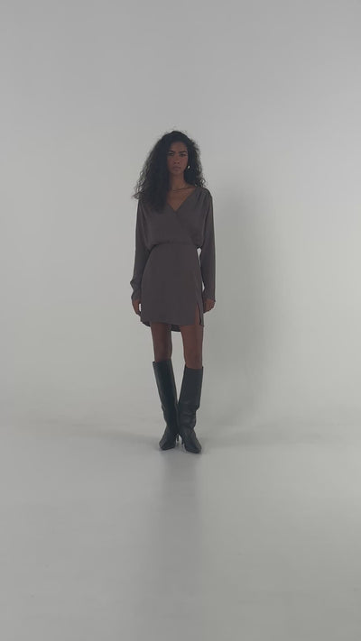Sukienka Rita zachwyca kobiecym krojem i starannie przemyślanymi detalami. Wykonana z mieszanki cupro i wiskozy o tłoczonym wzorze cętek, pięknie układa się na sylwetce i nadaje stylizacji luksusowego wykończenia. Delikatny rozporek u dołu, marszczenia przy dekolcie i na plecach oraz ozdobne guziki przy rękawach dodają sukience wyjątkowych detali, podkreślając jej unikalny styl.