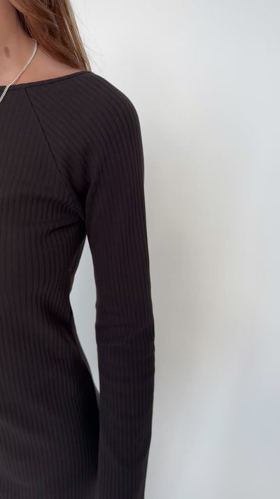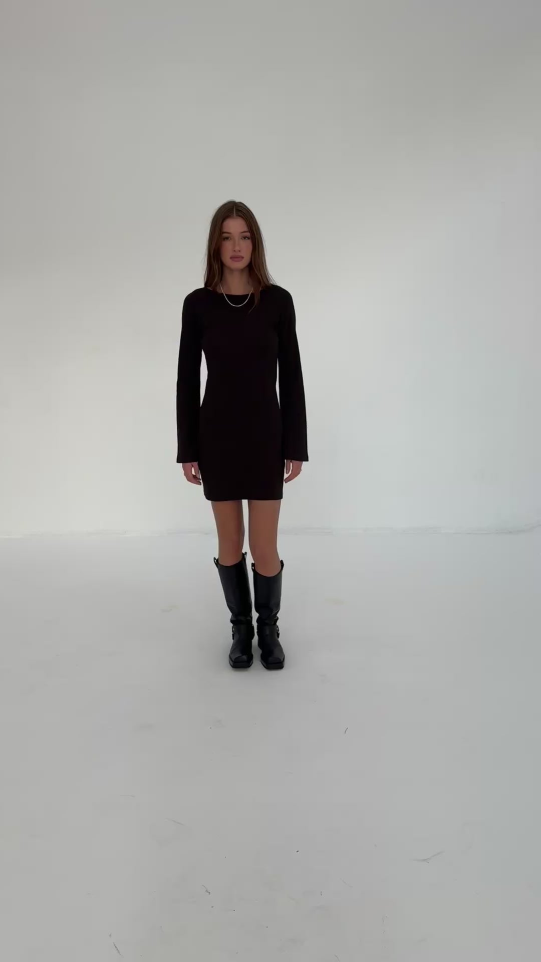Krótka wersja naszej bestsellerowej sukienki dzianinowej Sharon powraca w głębokim odcieniu gorzkiej czekolady. Wykonana z mięsistej, prążkowanej dzianiny, idealnie dopasowuje się do ciała i zapewnia pełen komfort noszenia.