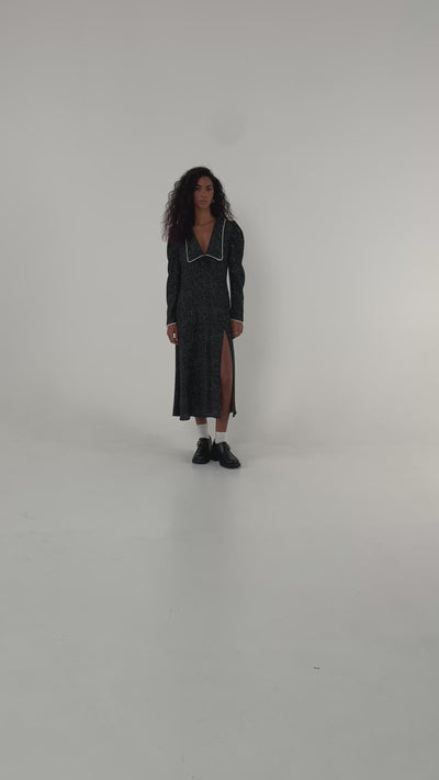 Sukienka Sophie to połączenie kobiecości i klasy. Jej szeroki, efektowny kołnierz z ozdobnym wiązaniem i kontrastowymi tasiemkami przyciąga spojrzenia, nadając stylizacji wyjątkowego charakteru. Delikatnie bufiaste rękawy i dekolt w kształcie litery V pięknie podkreślają ramiona i szyję, a rozcięcie z przodu subtelnie eksponuje nogę, dodając całości lekkości i wdzięku.
