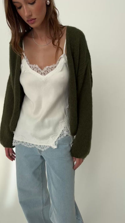 Delikatny i niezwykle kobiecy top Amy w kolorze białym to uniwersalna baza wielu stylizacji. Uszyty ze skosu z przyjemnej w dotyku tkaniny o składzie 60% lyocell i 40% wiskoza, lekko połyskuje i pięknie układa się na sylwetce. Ramiączka z metalowymi regulatorami oraz subtelnie wydłużony fason pozwalają uzyskać efekt elegancko wystającej koronki spod marynarki, swetra lub bluzy.
